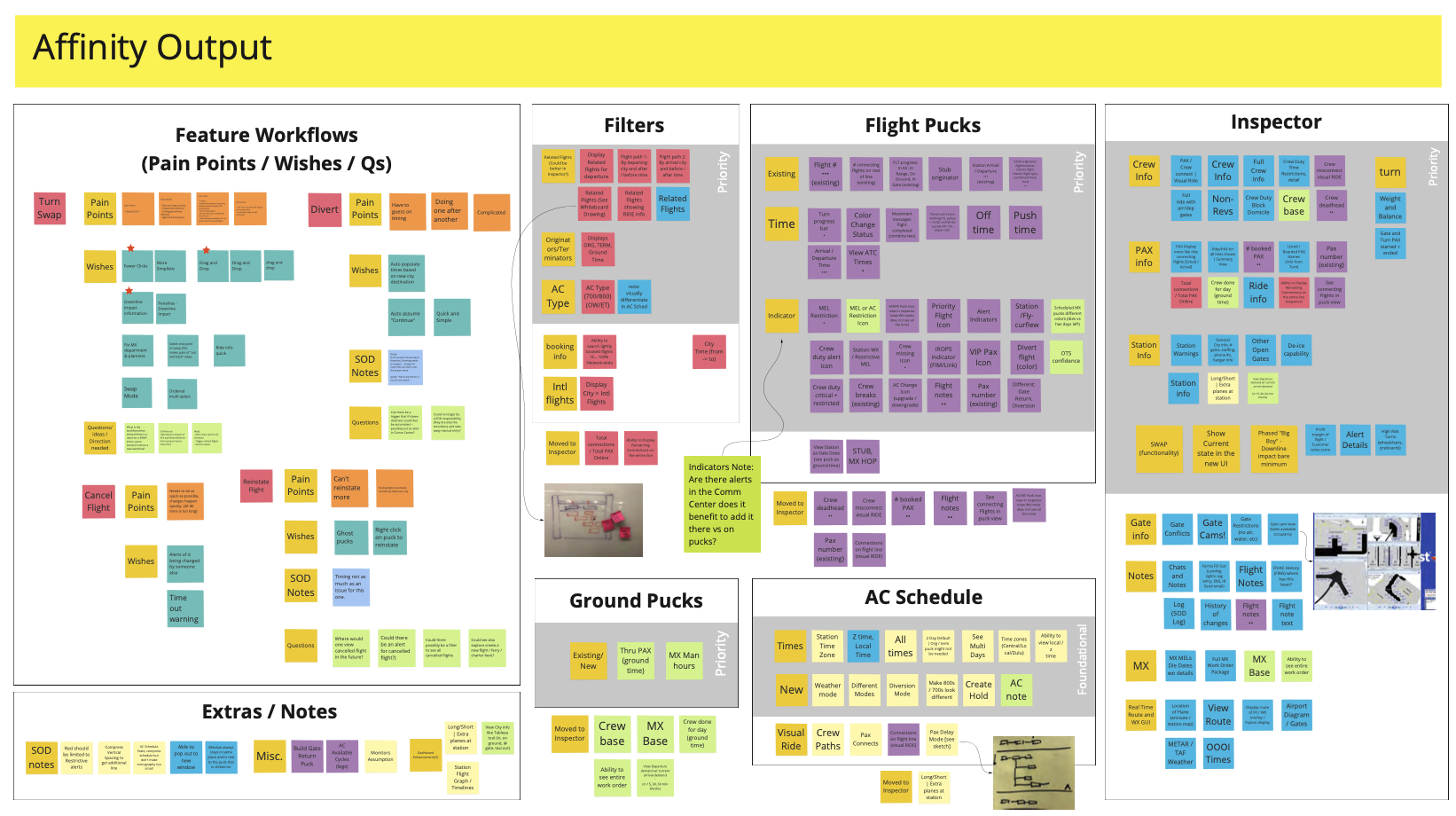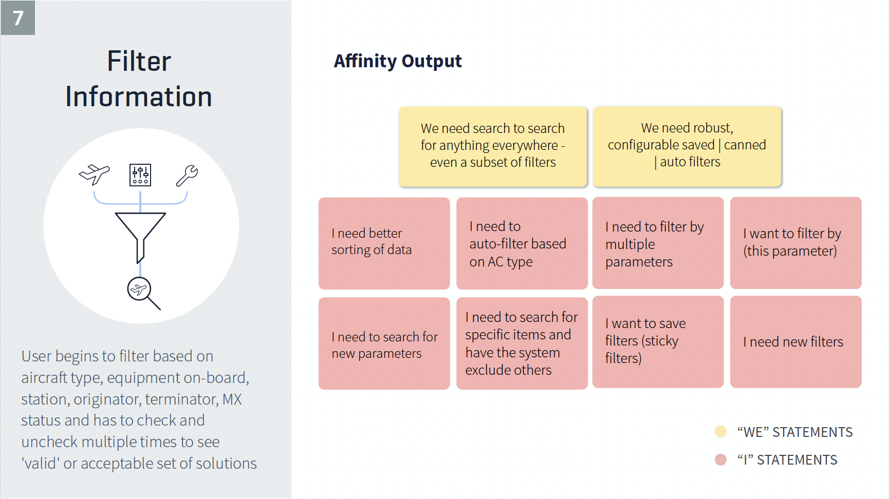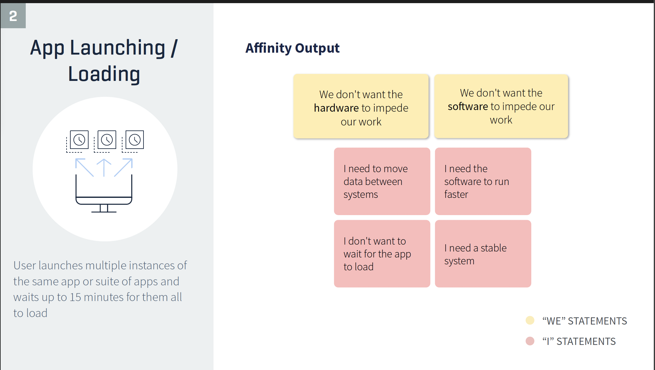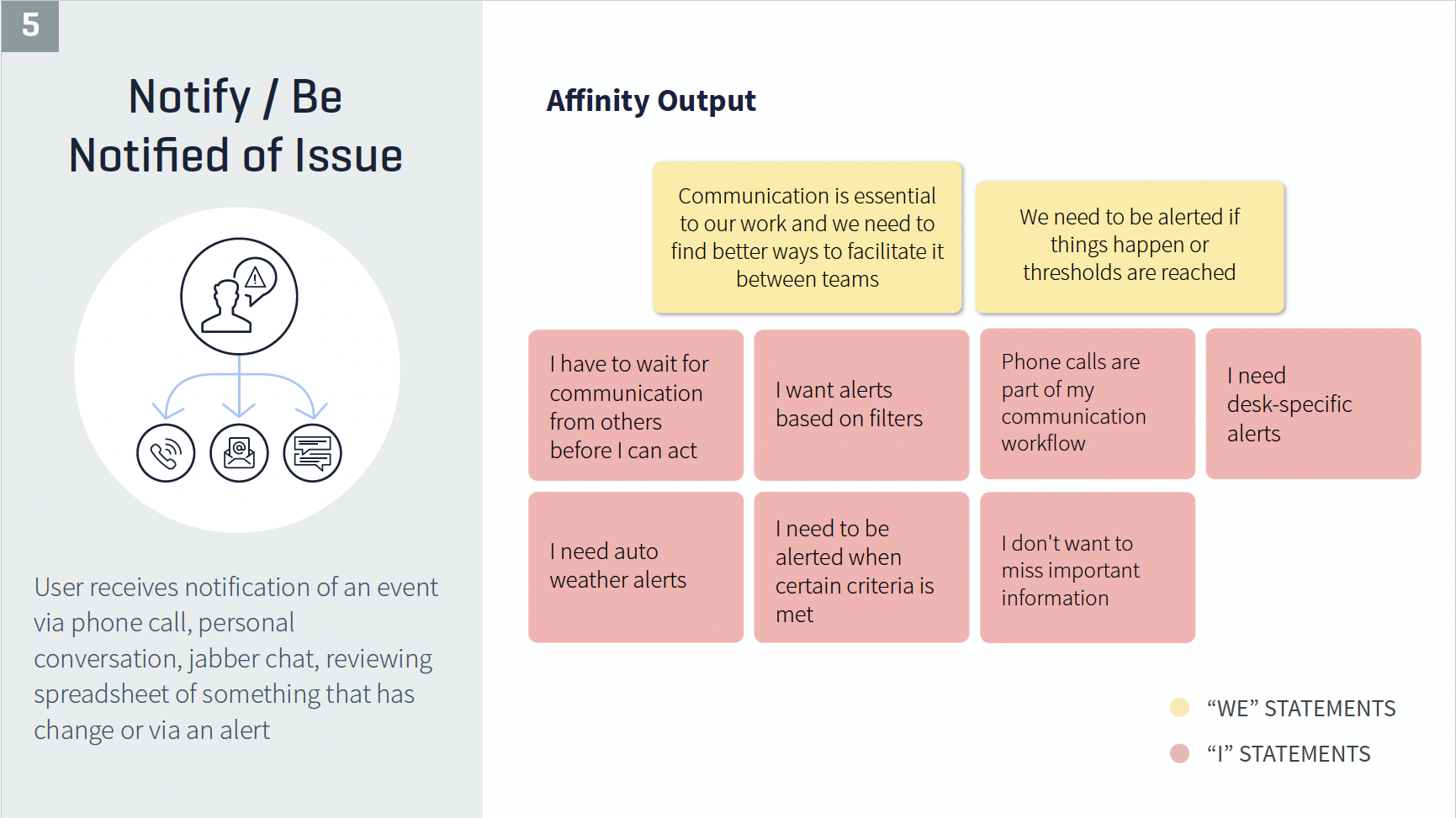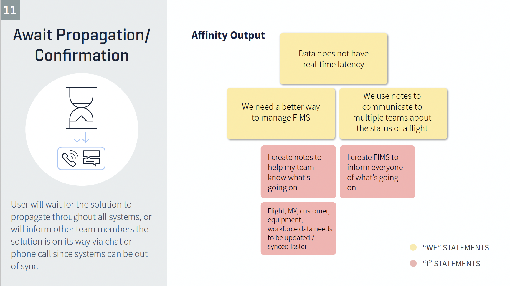 Notes, observations, and quotes were recorded and printed on sticky notes for collective analysis. Similar sticky notes are assigned “I” statements and summarized into broader “We” or theme statements. These summaries were then utilized to identify opportunities for improvement and enhancements.