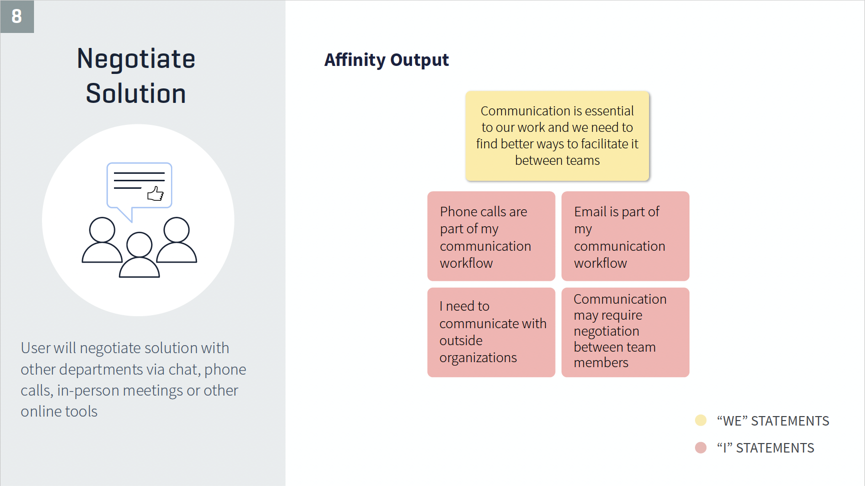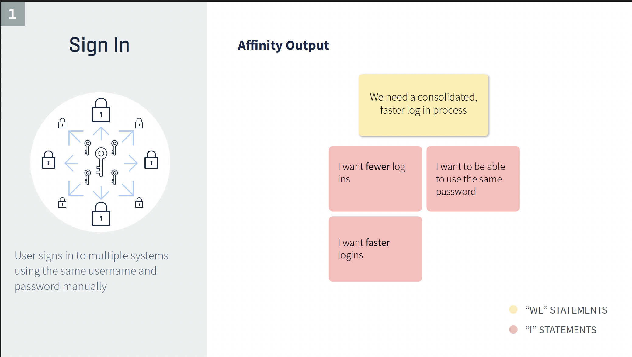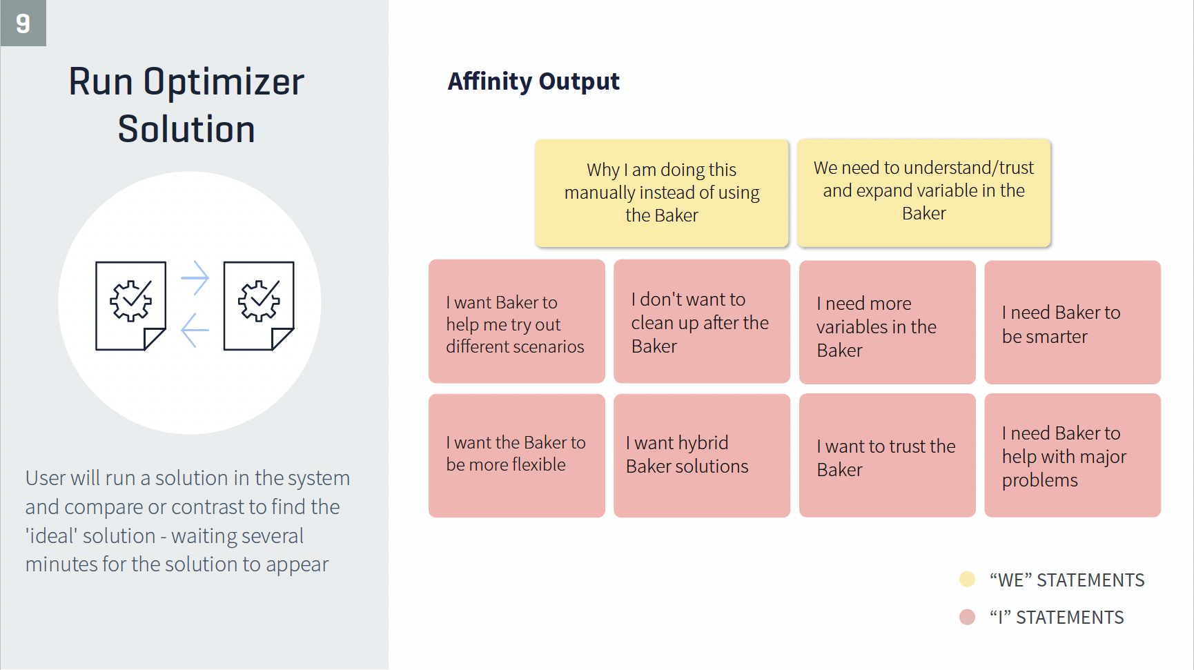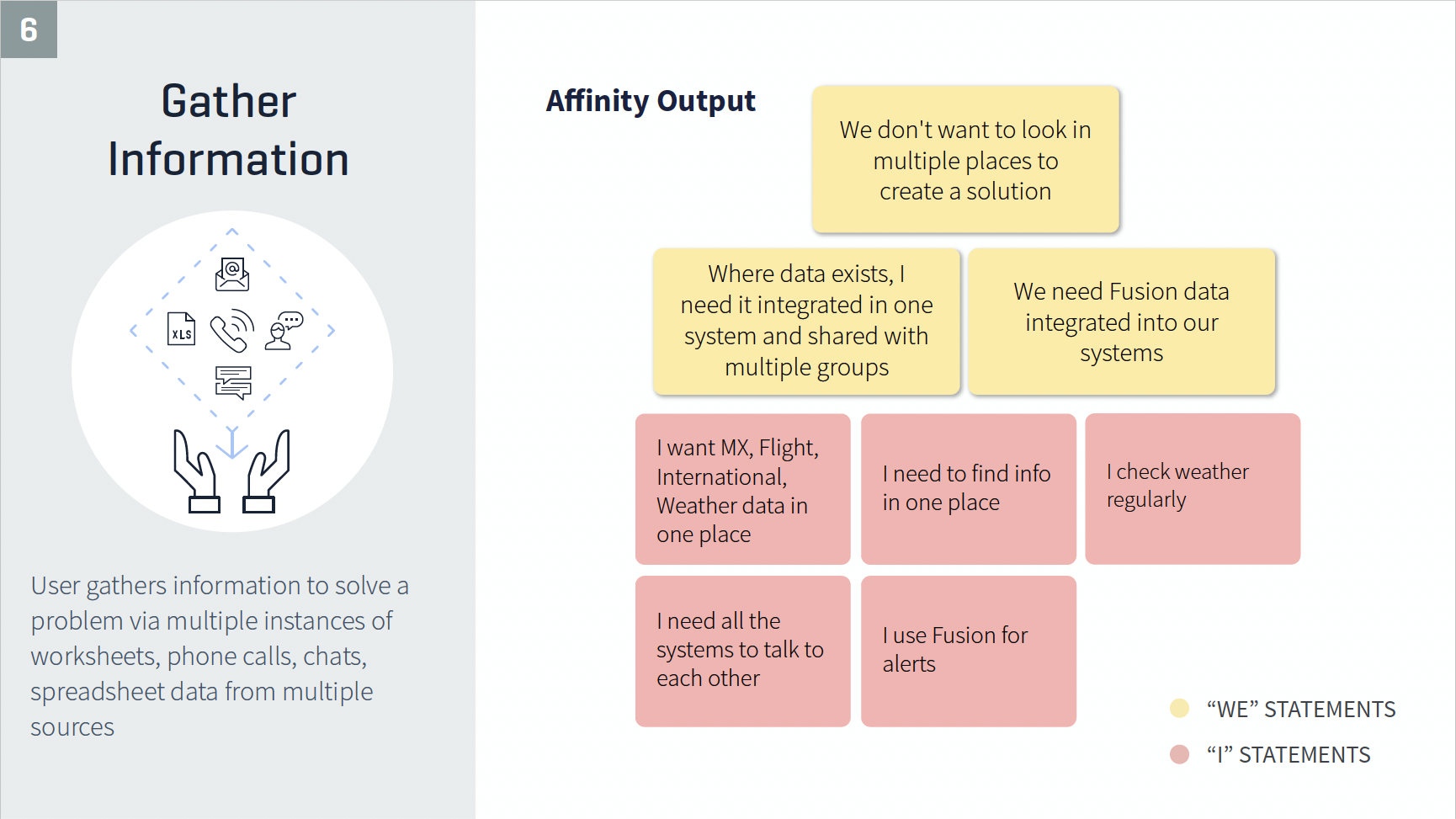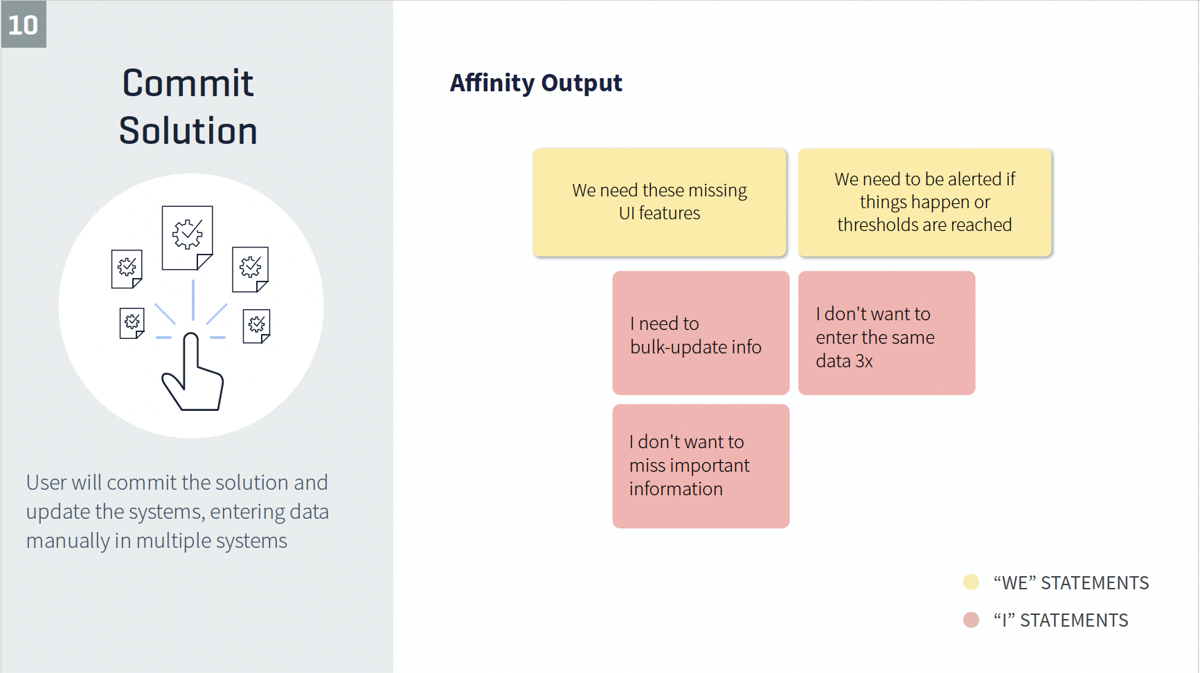 Notes, observations, and quotes were recorded and printed on sticky notes for collective analysis. Similar sticky notes are assigned “I” statements and summarized into broader “We” or theme statements. These summaries were then utilized to identify opportunities for improvement and enhancements.