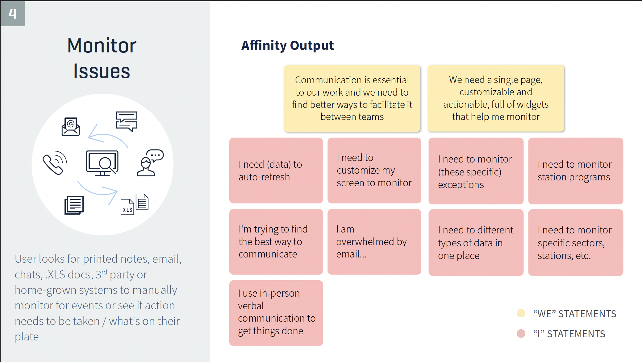 User ObservationsObserving the Superintendents of Dispatch (SODs) perform their daily tasks from the Network Operations Center (NOC). Through direct observation of the SODs, I was able to uncover their needs, motivations, and aspirations. By observing the users in their natural environments, I was able to: